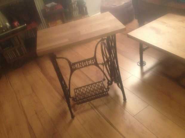 uso y un viejo marco de la máquina de coser como una pequeña mesa / estante (por ejemplo, lo usamos para poner nuestro tocadiscos en)