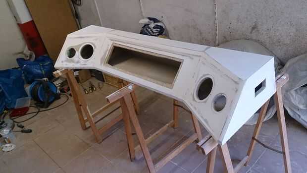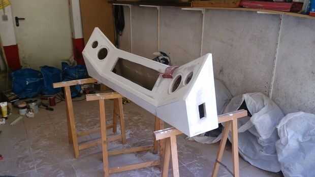 Otra vez, lija la pieza entera hasta que su superficie era muy suave. Ahora aplica la primera capa de la capa base. Después de la primera capa seque completamente, lijar la superficie una aplicada la segunda capa de la capa base. Repetí este paso cuatro veces. Desafortunadamente, era por ahora me di cuenta de que olvidé el recorte para el panel frontal. Una de estas cosas... usted debe definitivamente plan y antes de instalar (!) y encolado de piezas... Hacerlo a posteriori es bastante difícil y lamentablemente se ve bastante pobre.