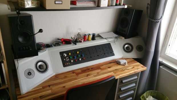 Me hubiera encantado cortar el panel frontal de la hoja de aluminio o hierro. Debido a las herramientas que tenía a la mano, tuve que utilizar 2 mm (0,08 pulg) MDF. Marqué todos los botones, potis y fader. Para los agujeros, usé una máquina de perforación. Para cortar las ranuras, es utilizado una Dremel. Al final, aerosol pintado el panel frontal de color negro.