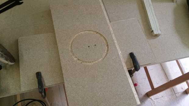 Este es el paso donde utiliza un router por primera vez en mi vida. Afortunadamente, he probado el router con algunos estantes no utilizados antes de realmente empezar usando para mi midi-codicioso. Por eso, me pareció que para mí la forma más fácil de cortar los agujeros para mis altavoces primero corte los huecos y luego cortar el círculo entero.