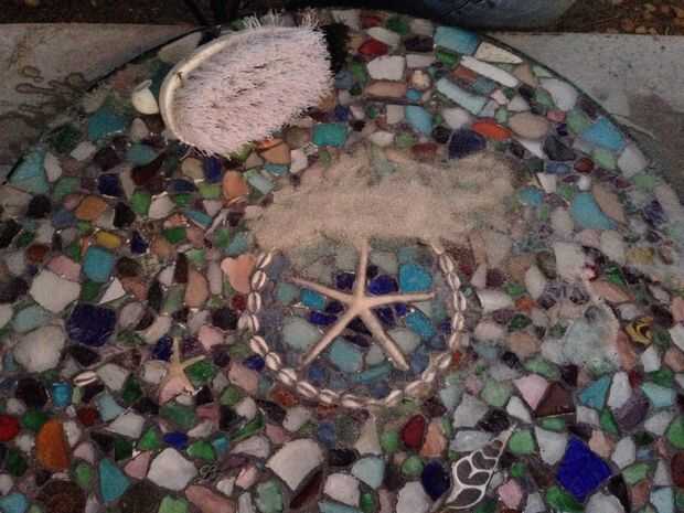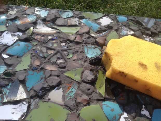 - Poner disolvente de pintura (aguarrás por ejemplo) en una pequeña esponja y frote las piezas de mosaico