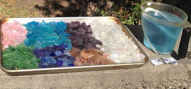 Limpie y seque sus materiales mosaico antes de usar.  Mi forma favorita es remojar las piezas en la dentadura más limpia (completo tutorial aquí). También puedes limpiar con alcohol isopropílico o remójelos en una solución jabonosa.  Organicé mis piezas por color.