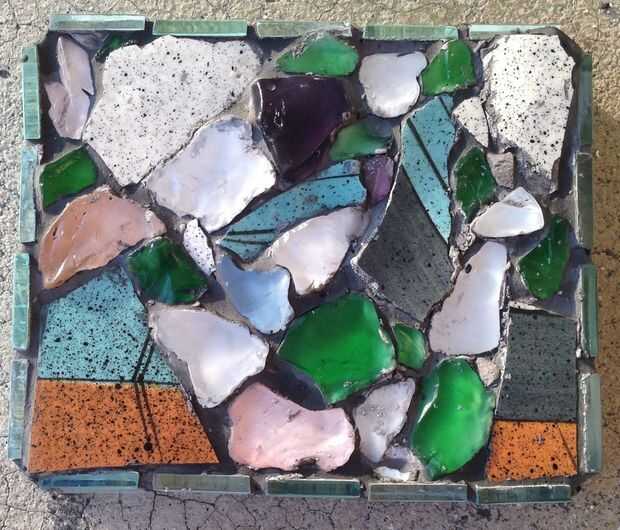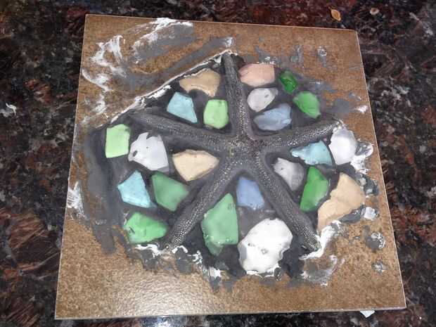 Si algo va a salir mal no desea que esto ocurra en la mesa así que le sugiere hacer unas pequeñas probetas. Mina de sobre $.75 azulejos. Fue una cosa buena que hice una prueba ya que como se puede ver en la imagen, la lechada de color mi estrella de mar. Toda la mesa rectangular fue mi tabla de práctica antes de que hice la ronda (mi hermana me mataría si perdió su colección de vidrio de mar)