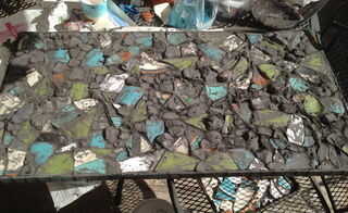 Mesa con mosaico de azulejos con incrustaciones de tapa de cristal