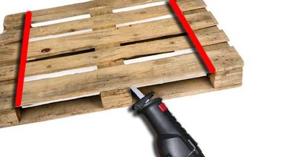 (2) "método rápido": (ver foto de arriba con los dos cortes de línea roja) es la forma más rápida a zip una sierra circular por el interior los bordes de la plataforma (donde he dibujado las dos líneas rectas rojas, fotografiadas de arriba). Entonces, trabajar las plataformas loose-ish por les tambalea como un volante, hacia adelante y hacia atrás, hasta que usted puede deslizar una sierra alternativa entre cada tablero y el marco para cortar los clavos que sujetan el tablero al marco medio. Usted puede procesar una plataforma en unos 10 minutos así (una vez que lo hacia abajo).