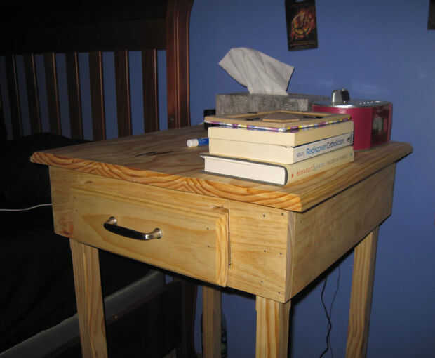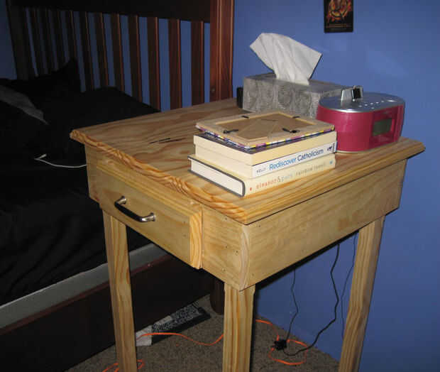 Este proyecto hará una mesa grande, acabado o una mesa con un cajón. La mesita de noche es de unos dos y medio pies de alto (las piernas pueden ser acortadas o alargadas según su preferencia) y cerca de dos pies de ancho. Tiene un cajón de trabajo y un acabado ligero.