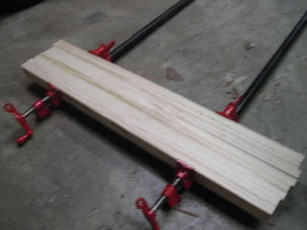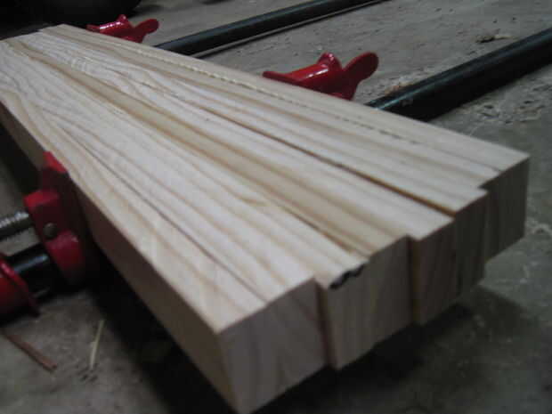 Una vez cortadas, usted puede unir las 8 tablas, hacer 4 patas. Es una buena cosa si usted tiene pequeños gránulos de pegamento exprimido hacia fuera cuando las placas se presionan juntos.