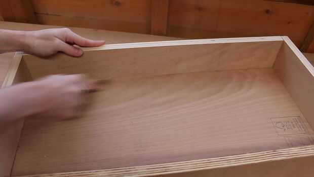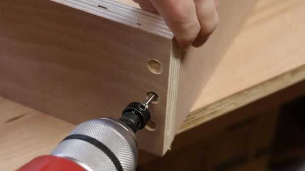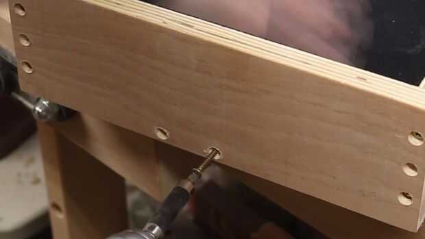I agregar pegamento a los bordes expuestos de madera contrachapada y había construido la sujeción de la caja con tornillos para madera. También he añadido un par de tornillo para ayudar a mantener la base en su lugar. Estos se ocultarán por las piernas más adelante.
