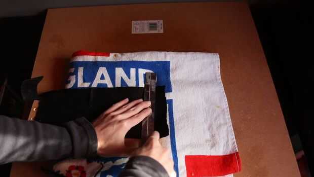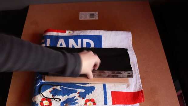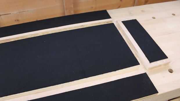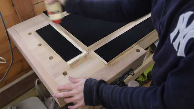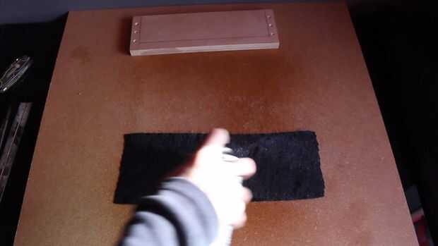 Luego desmonté la caja para que pudiera cubrir las piezas con el paño de fieltro negro. Me resulta mucho más fácil cubrir las piezas como esta en vez de la caja esté juntos. Con fuerte spray adhesivo apliqué el fieltro fieltro sobredimensionado el las piezas. El uso de una regla y un cuchillo afilado cortar el fieltro fieltro para mi marca de antes. Esta hojas exponen que puede recibir el pegamento y debe quedar atornillada a la madera contrachapada.