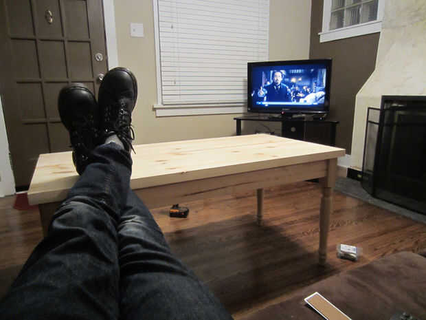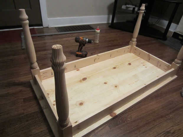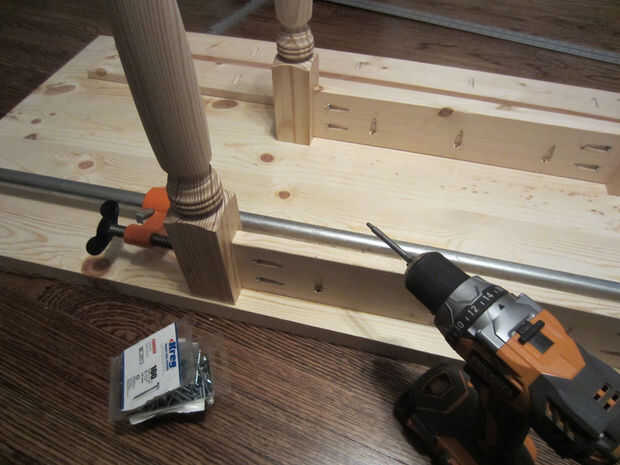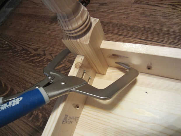 Fijar primero las patas al marco y luego fije el marco a la mesa. Usé un poco de pegamento para madera en la parte superior de las piernas. Si utilizas pegamento, asegúrese de limpiar cualquier exceso para asegurarse de que la mancha penetrará la madera posteriormente. Tener unas pinzas en la mano es muy útil para esta parte.