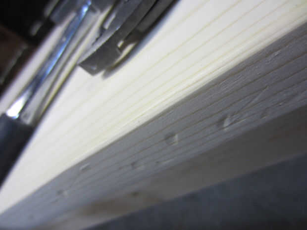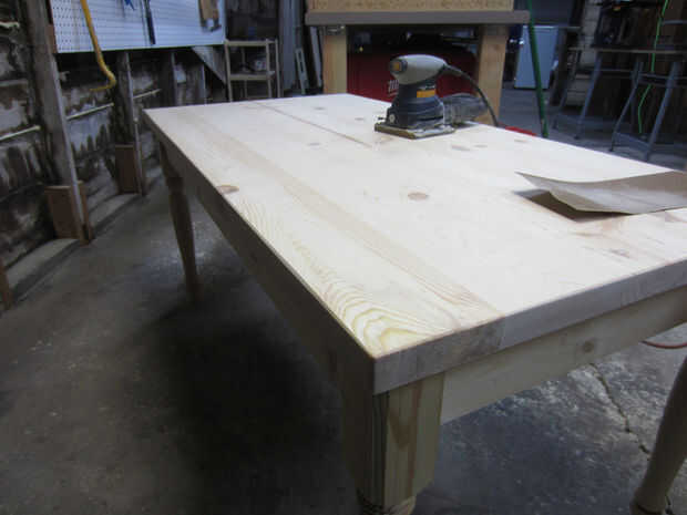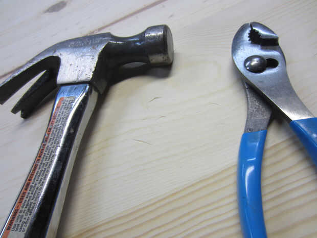 Después de lijar, tomé algunas herramientas y poner algunas abolladuras al azar sobre la mesa a disfrutar de la mancha y crear un aspecto envejecido.