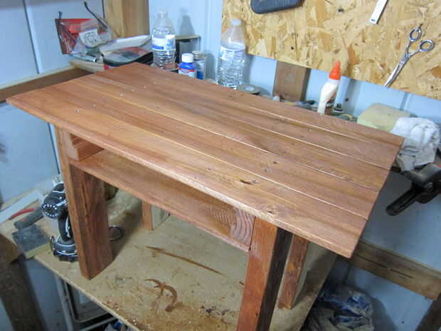 Todo que hizo se corta 4 tableros de madera para encajar debajo y equipos en mi mesa de base. Hizo un bonito estante pequeño.