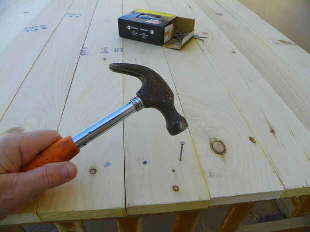2 clavo las uñas en el extremo de cada tabla, los clavos que utilicé fueron 1-1/2" de largo. Asegúrese de que entran en la siguiente tabla.