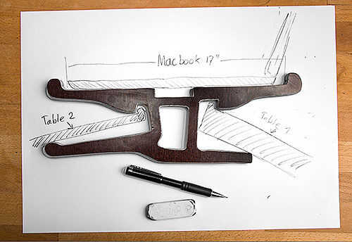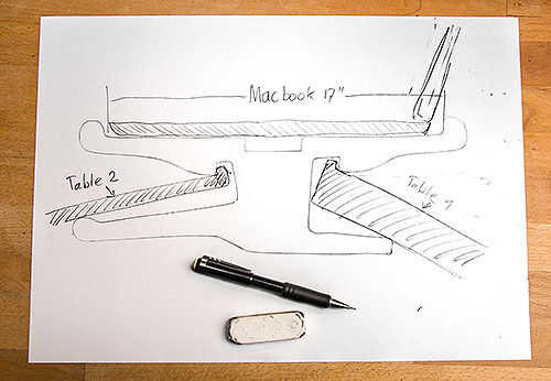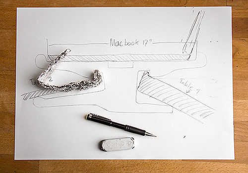 Para hacer el dibujo de construcción que dibujé una vista lateral de mi libro Mac 17" en un pedazo de papel. Luego dibujé la estructura de la tabla alrededor de la impresión de papel de aluminio. Después de algunos experimentos, me di cuenta, cuánto tiempo la estructura de soporte inferior tuvo que ser para la mesa de PC tendría el ángulo recto.