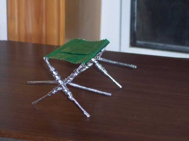 Exactamente igual que el proyecto de bandeja de TV, las piernas (largas piezas) necesitan a través de la parte inferior de cada soporte de V. Esta vez, ya que tienes los soportes de asiento allí, asegúrese de que los soportes se encuentran en la parte superior sobre el puente de la "V". Cada soporte de "V" tendrá 2 patas en lo que parece una "X". (con la incorporación de los soportes del asiento que realmente parece un asterisco, pero estoy divagando). Deslice ambas piernas a la misma distancia hasta la parte inferior de la V en el punto medio de ambas piernas (cerca de 1 1/4 pulgadas de cada extremo). Los conectores (1 pulgada había doblada piezas) deben estar en el mismo extremo de la "X". También necesitan estar apuntando en la misma dirección y ser separadas entre sí aproximadamente 1 1/2 de pulgada.