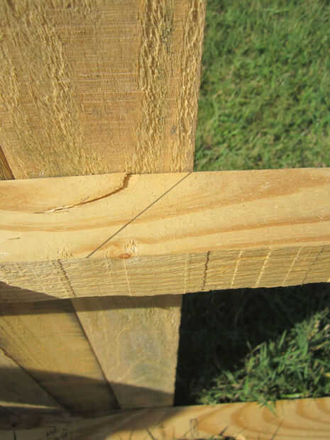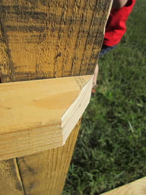 Una vez que todas sus tablas están asegurados, puede quitar las tablas que están en los extremos. Con esos tablones ido, marque una línea en cada viga transversal donde se hará un corte de 30-45 grados para eliminar el exceso de material. El ángulo es una cuestión de preferencia personal, no desea cortar en un ángulo de 90 grados por el aumento de la probabilidad que tu hijo será golpear su rodilla cuando van a sentarse o levantarse. Que mina corte a 45 grados. Probablemente usted necesitará usar una sierra de mano para esto. Una vez cortados todos los travesaños, se acaba tu mesa!