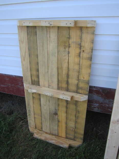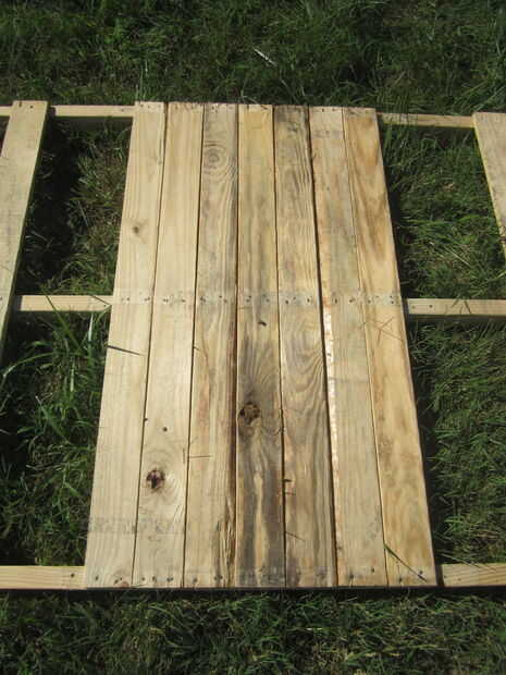 Si nos fijamos en los tablones de la plataforma, probablemente te darás cuenta que uno es más suave que el otro. Para nuestros propósitos, creo que con el lado más suave, como la parte superior tiene más sentido. Una vez que haya determinado qué lado de las tablas que desee utilizar como "up", elija las 7 tablas que están en las mejores condiciones y los ponen al lado en el centro de la plataforma de cross vigas que se se conservan cuadrados por esos carriles final (ver foto). Utilice una cinta métrica para asegurarse de que el tablón del centro más esté alineado con el centro de dos vigas cruzadas, luego utilice dos clavos en cada extremo y dos clavos en el centro para fijar a las vigas transversales. Repita esto para cada uno de los tablones, asegurando que son empalmados uno contra el otro tan ajustadamente como sea posible.