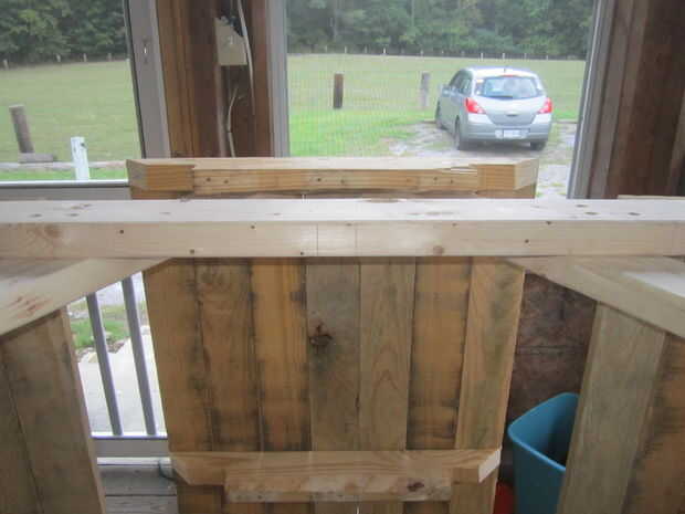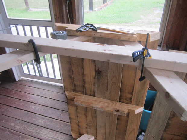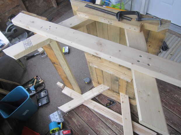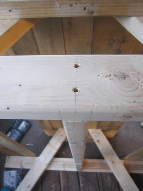 En las piernas de la tabla, haga una marca en cada pierna paralela al suelo que se utilizarán como guías para colocar el Banco a las piernas. Después de esto, baje el Banco hacia abajo sobre la mesa debajo del Banco está descansando en las piernas (esto probablemente tendrá sentado debajo de sus marcas) y punta de la tabla hacia arriba en un extremo. El extremo mirando hacia arriba, alinee el riel del Banco con sus marcas y utilice las pinzas para sujetarla. Fijarlo con más de los tornillos de 2,5". Otra vez usé tres por punto de montaje, pero los pernos de carruaje pueden utilizarse aquí en lugar de otro si se prefiere. Voltee la tabla y repita el procedimiento para fijar el otro extremo de la banca a la mesa. Tomar uno de sus restantes 2 x 4 y cortar a 42"(otra vez, depende de las dimensiones de la mesa - sólo quiere que coincida con el interior la distancia entre las vigas del Banco). Haga una marca en el centro de cada larguero del Banco en el centro y asegúrelo con dos tornillos de 2,5" por fin. No estoy seguro que esto es realmente un miembro estructural, pero parece hacer más segura la tabla general y mi hijo le gusta poner los pies para arriba en él.