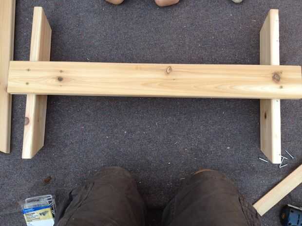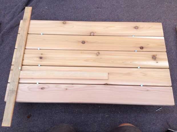 Centro y alinee la junta central superior y atornille hasta el soporte superior con tornillos espaciados uniformemente en cada extremo. Agregar el resto de los tableros, espaciados con clavos, o apretados uno contra el otro. (Hice los 10 primeros más o menos con espacios, pero a medida que envejecen, creo apretados uno contra el otro es mejor).