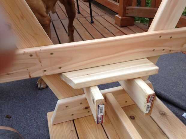 Este espacio funciona bien para mí: con la tabla boca abajo, una desecho pieza en el extremo, uno por su lado y atornillar los soportes del asiento. Asegúrese de que está uniformemente a cada lado.