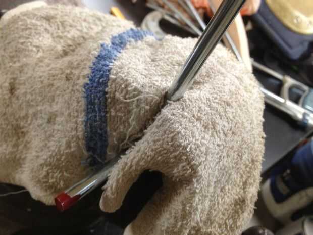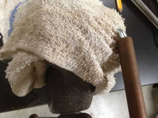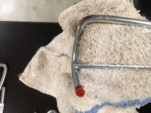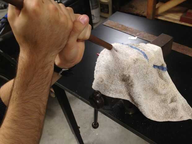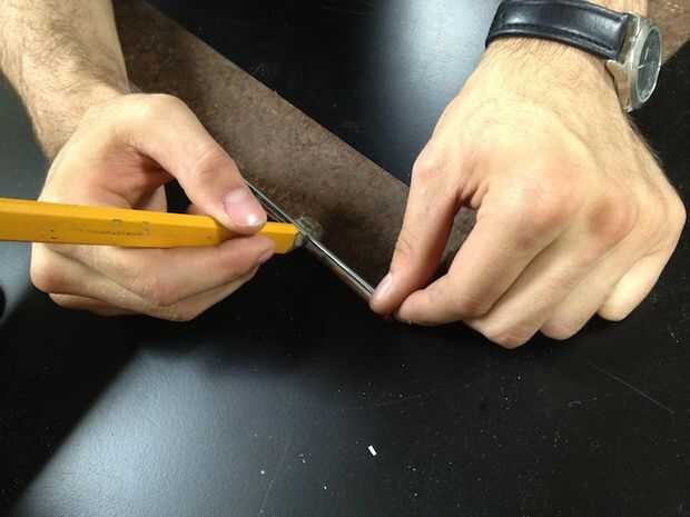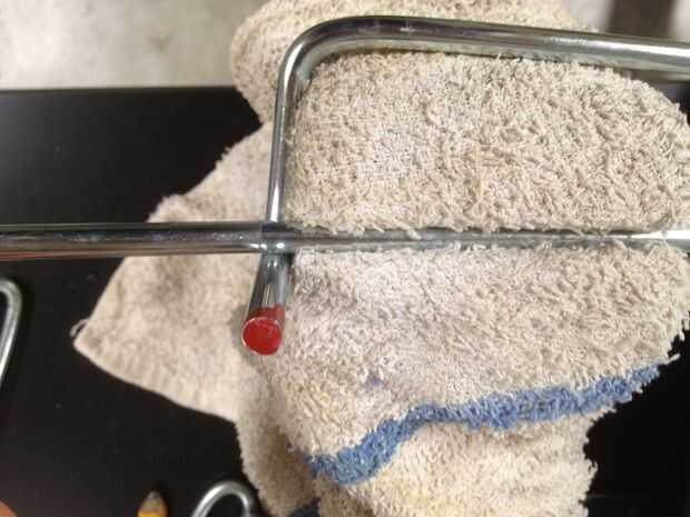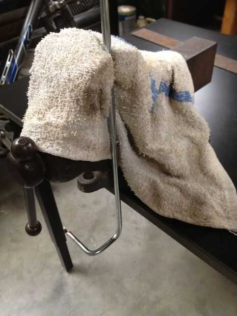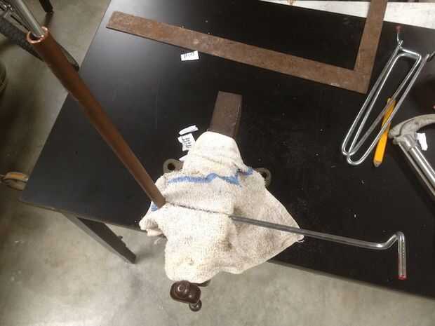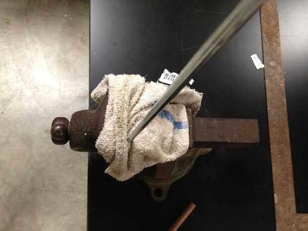 Después de marcar de varias longitudes (2,5" para la sección rotatoria y el lado más corto y 12" para el principal apoyo lateral), configurar un improvisado flexión plantilla usando un tornillo de mesa pesada y una sección de la tubería de cobre del desecho. Asegúrese de cubrir los dientes de la mordaza con un paño suave, o bien riesgo excavación muescas en la varilla. Coloque la varilla en la plantilla y apriete en la primera marca. Introduce el tubo de desecho por el resto de la varilla y dóblela hacia abajo, utilizando la prensa como el fulcro. Objetivo para 90° - tendrá que doblar un poco más allá de los 90 debido a la parte posterior de resorte natural del metal. Retirar la pierna de la plantilla y gírela 90 º por lo que la parte doblada es paralela a la apertura de vice, luego vuelva a apretar en la marca siguiente (2.5" abajo). Repita el proceso de modelado.