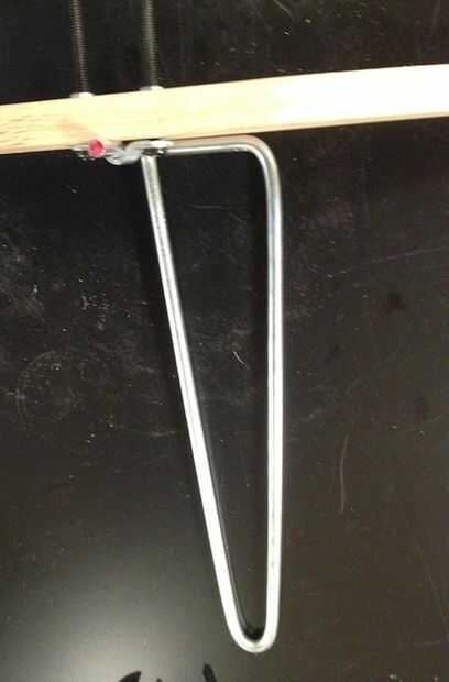 Ahora debe tener una barra de mesa 3D con curvas de 90 de 2 ° en él. Ajustar la barra de posicionamiento para que la vice lo agarra en la siguiente marca y curva 90°. Su barra ahora debe ser formado como en la imagen 8. Ajustar para que quepa para que la curva es hacia arriba y situado en la punta de la mordaza. Doble la varilla hacia abajo y bajo la forma de gancho para que te queda con una varilla de forma que en el cuadro 8. Por último usar cortadores de cerradura o una herramienta de corte de metal similar mano cortar la varilla de sobra en la "Unión" entre la hipotenusa y la sección del eje de rotación (ver figura 9).