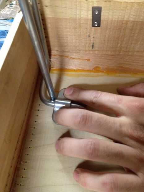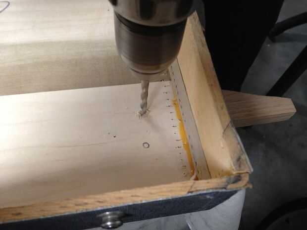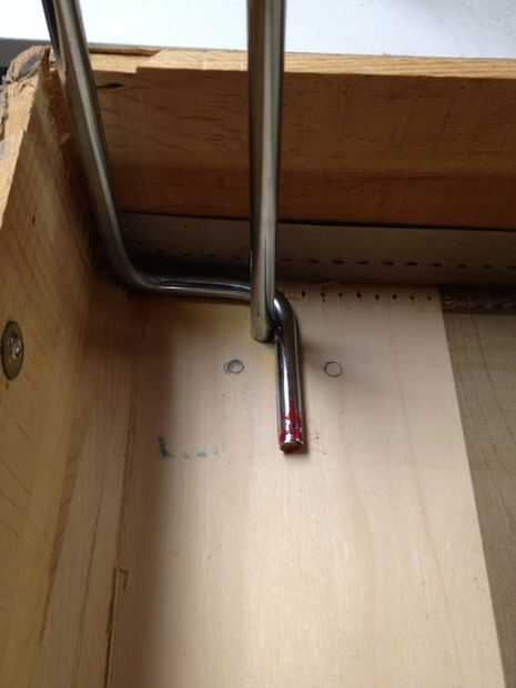 Por último, esto es cuando usted debe adjuntar las piernas de la tabla. En realidad, perforaron los agujeros anteriores, había forrado el interior y tuvo que volver a taladrar los agujeros. Haciendo ese paso ahora sería mucho mejor. Línea de la pata de la mesa para que encaje perfectamente en la esquina misma de la maleta y prueba que puede doblar dentro y fuera de la caja. Usaba soportes pequeños que encontré en casa Depot con un bend de medio círculo que el eje de rotación de la pierna se ajusta para sujetar mis piernas de la tabla y permiten doblar. Marcar los puntos de sujeción y taladrar los agujeros. Asegúrese de que la broca es muy aguda, como la tela interior puede enganchar y giro si es demasiado aburrido. Luego coloque las piernas en las 4 esquinas. Utilicé tornillos cabeza de pan simple y tuercas hexagonales para asegurar los soportes de montaje.