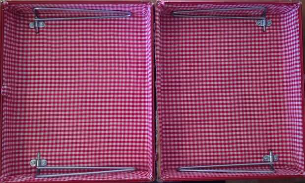 Estamos consiguiendo cerca terminamos ahora. Me ha gustado los detalles de adornos (adorno exterior de goma, metal interno ajuste cubriendo los bordes de la maleta que sellar juntas, así que decidí pintarlos todos color rojo brillante. El metal pintado fácilmente, pero el caucho necesita varias capas de pintura se adhieran fuertemente. Una vez que había terminado de secar, añadí el ajuste interior del metal hacia el caso. Esto fue bastante difícil, encajan muy bien, y asegurar que todo el revestimiento interior y exterior que cubre a la tela estaba metidos dentro del adorno realmente mucho tiempo. Finalmente lograron conseguir el adorno bien asegurado alrededor de casi todos los bordes (uno de los bordes inferiores era una causa perdida, pero pensé que no mal 7 de 8). Pegué el ajuste de goma (rojo ahora) vuelva a colocar en el exterior de la caja, cubriendo la madera expuesta.