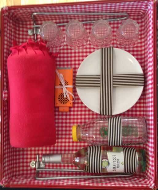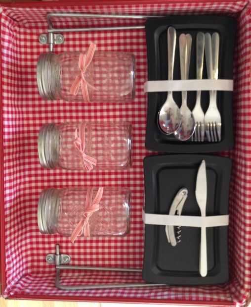 Por último, añadir el almacenamiento de alimentos y menaje con las secciones. Esto es altamente individualizado para lo que quieras traer tu picnic. He añadido 3 tarros de mason para ensaladas y platos similares, dos grandes emparedado estilo tupperware envases, 4 placas, 4 vidrios, espacio para una botella de vino (y una botella de agua reutilizada de una antigua botella de leche) y espacio para una manta para sentarse. He decidido no montar mis altavoces a la caja cuando me gustaba mis altavoces para ser más portátil (a veces nos juega frisbee o alejarse de donde hemos establecido nuestro picnic originalmente). En cambio, até cintas para atar al caso. La mayor parte del almacenaje está conectado a través de cintas y amarres o elástico. Todavía estoy buscando una mejor solución para las copas, actualmente nos sólo envuélvalos en la manta para que no pueden moverse y romper otras piezas de almacenaje.