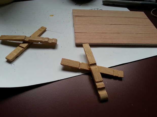 Ahora con las pinzas para la ropa, quitar ambas piezas de madera de la primavera en cada uno de ellos. Determinar el ángulo o la altura a la que se sentará la mesa.  Mina era cerca de 30 grados o lo que parecía sobre derecho. Pegue las dos piezas de madera en el ángulo derecho y asegúrese de que coinciden o usted terminará con una mesa de desequilibrado.