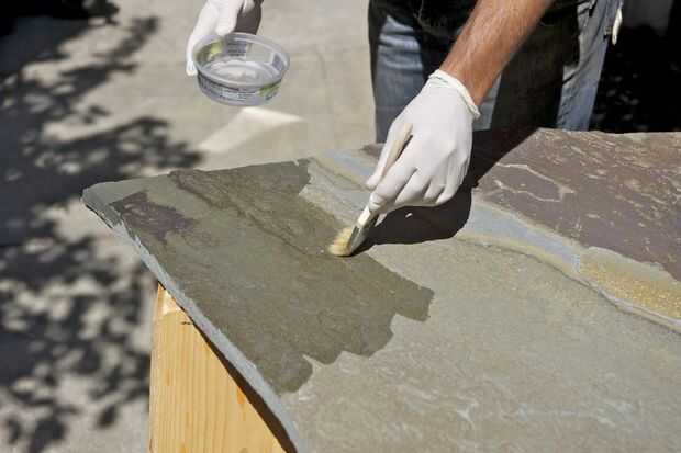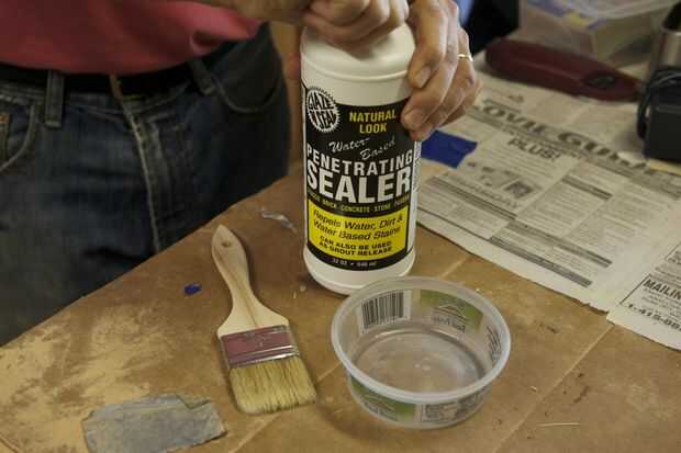 Siga las instrucciones en el sellador y la roca del sello. Consiguió un sellador a base de agua y aplicar dos capas con pinceles. Era super fácil de poner y no cambiar el color o la textura de la roca. El sellador definitivamente funciona porque después hemos aplicado, las gotas de agua de cuentas hasta en el lugar de absorción en la superficie.