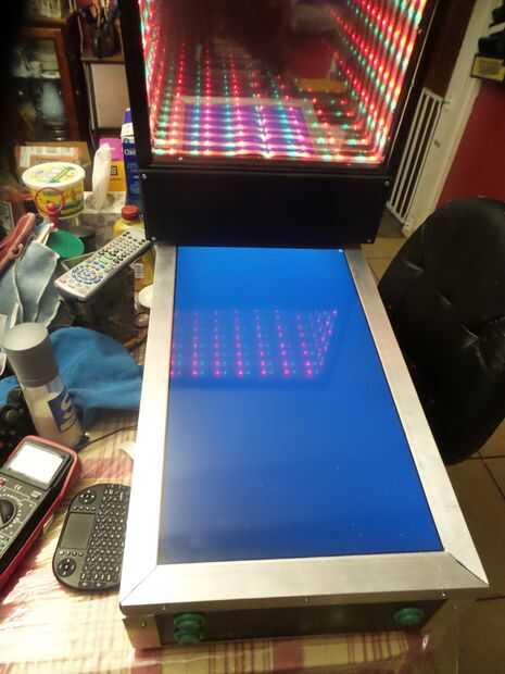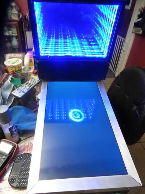 esto es una mesa de café construida del campo de juego de una máquina de pinball. Es bastante fácil de construir y lo mejor de todo, se enciende! Se inspiró en un bar en Seattle llamada Shorty, que cuenta con mesas similares a estos en sus cabinas. M