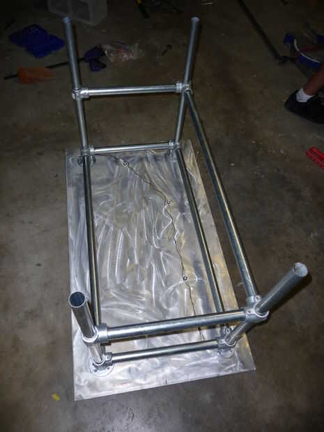 - Tubos se miden y se cortan con una ingletadora o una sierra para metales. Montados en marcos y cayó sobre las piernas.