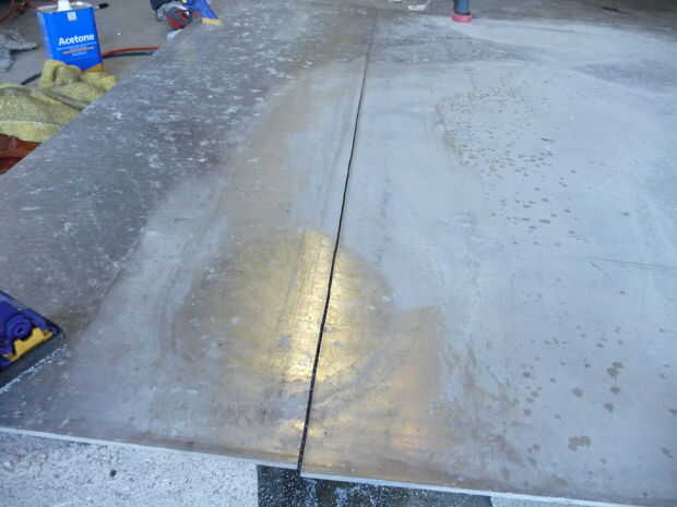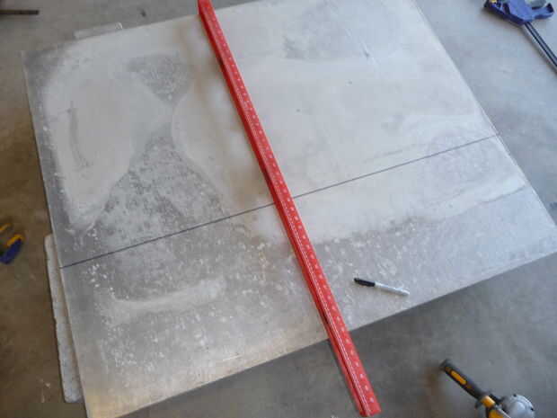 Montar la placa sobre caballetes o bloques de cemento con unas abrazaderas de barra. Con un nivel y un sharpie, marca líneas completas para sus cortes. Mida dos veces, corte una vez.