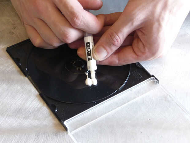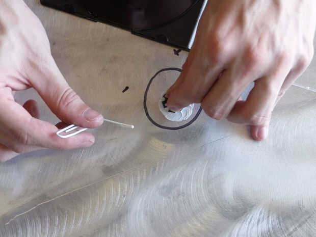 Raspar con lija o pulir con el cepillo de alambre, dondequiera que un LED se consolidado. Necesita una conexión limpia con el aluminio para transferencia de calor adecuada, entonces frote la raspadura con algunos acetona y un trapo. Mezcle su Artic Alumina cerámica térmica epoxi, del tamaño de un guisante de cada tubo para tres LEDs. Aplicar a la placa de aluminio, presione hacia abajo el LED y moverse en un pequeño círculo hasta que haya cobertura total. Esperar ~ 10 minutos para que el epoxi se endurezca.