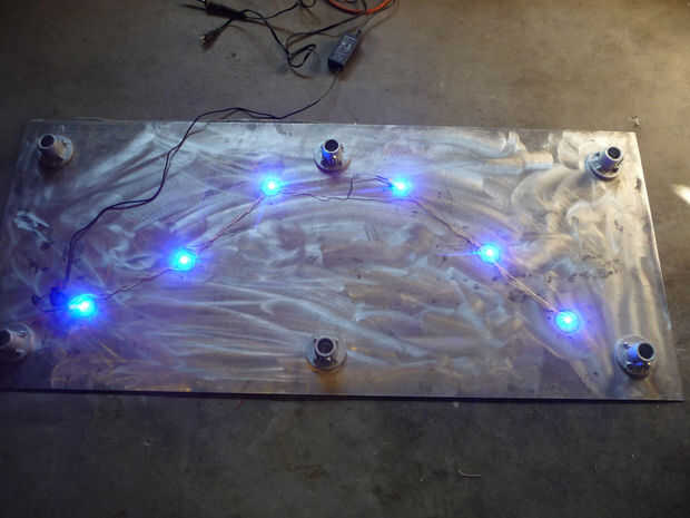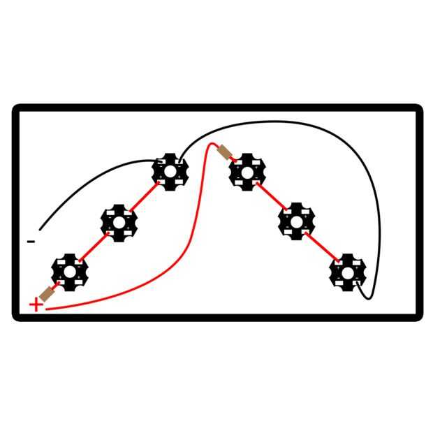 Conectan el LED según la imágenes y el diagrama de abajo, de un negativo en positivo. Dos cables positivos provienen de la fuente de alimentación en la resistencia al inicio de cada serie. La negativa final de cada serie se unen y volver a la fuente de alimentación.