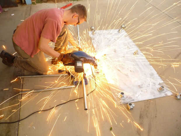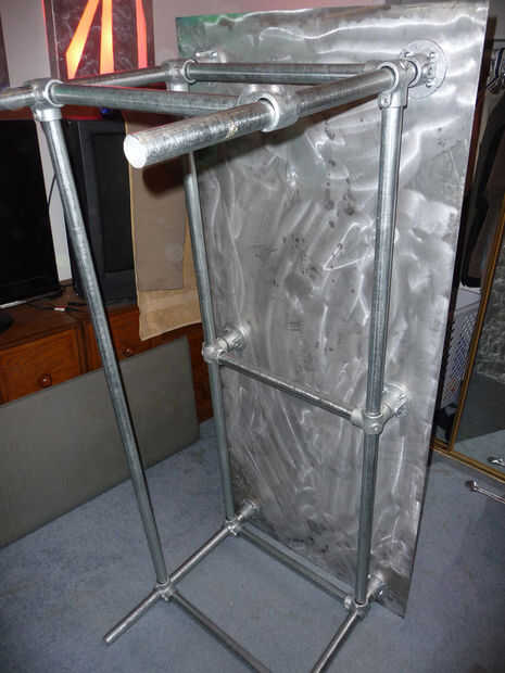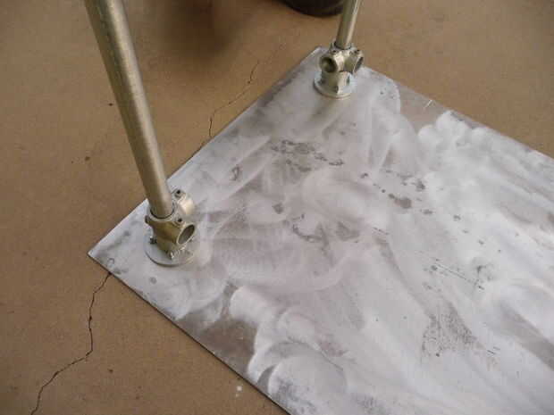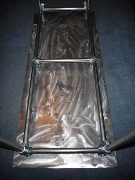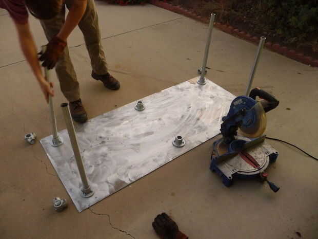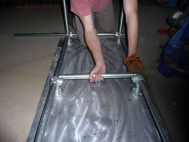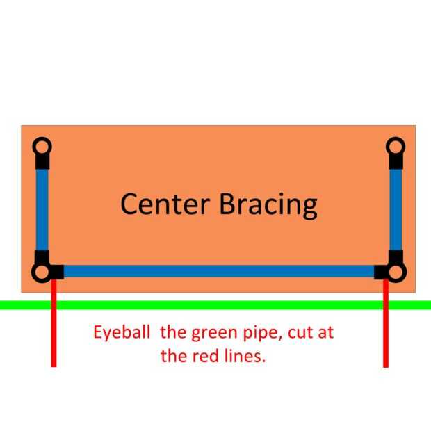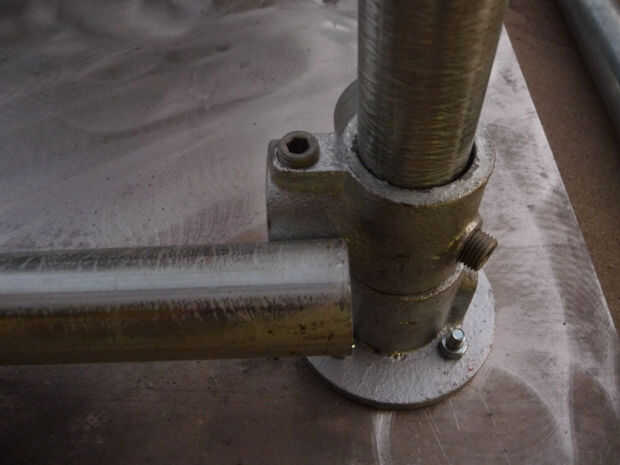 Deslice dos Tees de Slip-on de dos en dos de las piernas, colocar el tubo junto a ellos, marque y corte con la sierra. Las imágenes son ejemplos. Una vez cortados los tubos del anillo superior, apriete los tornillos hexagonales de Kee Klamp ligeramente. Luego coloque el anillo sobre sus cuatro patas, que probablemente necesita empuje para montar.