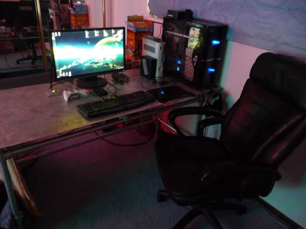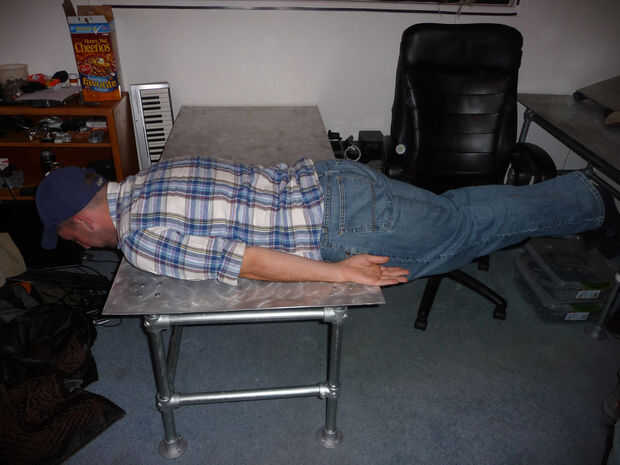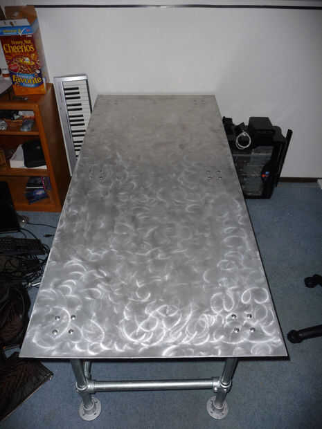 Se trata de un escritorio personalizado, que se ajuste la altura de su sesión. Había medido mi altura brazo de descanso natural y escritorios de oficina, la altura de escritorio promedio 29,5"(750mm). Tener en cuenta el espesor de las placas y bridas, un total de aproximadamente 1/2" para mí. Sugiero una sierra para cortar ingletes, si no tienes uno, una sierra para metales.