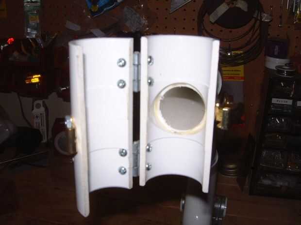 usé una sierra para cortar en la mitad de la t de PVC utilizada para hacer la pinza. El corte debe ser muy recta en orden para la abrazadera de la bisagra correctamente.