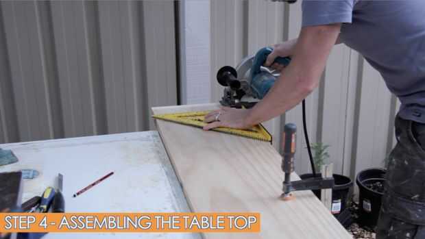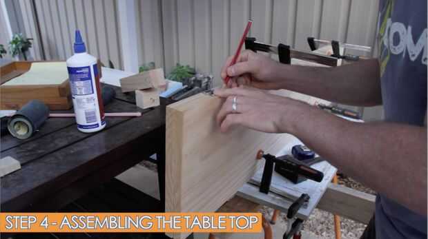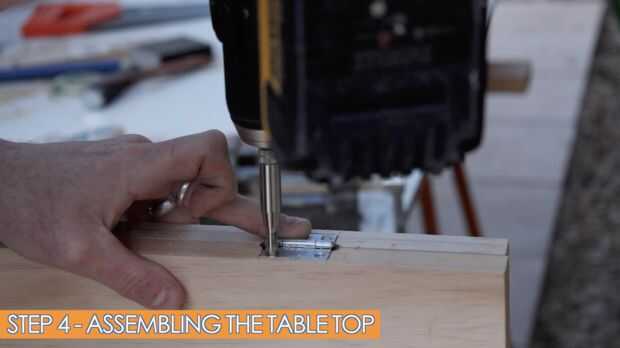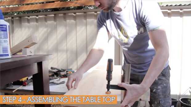 En el paso 4, montamos la tapa de tabla. Se compone de 2 piezas de madera con las mismas medidas. Utilicé 2 tableros ancho 285 milímetros, pero también puede usar una tapa laminada.