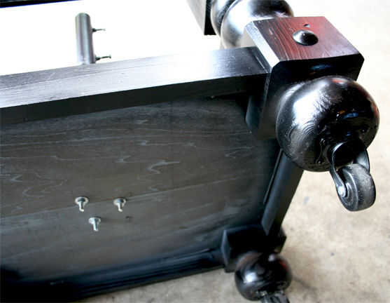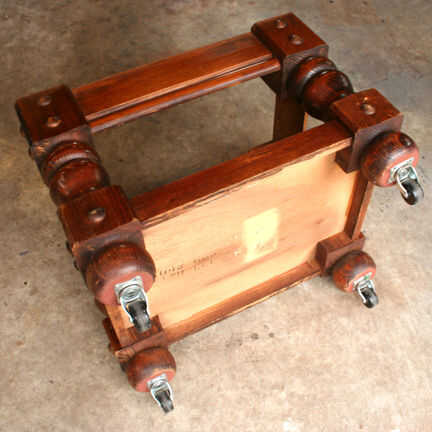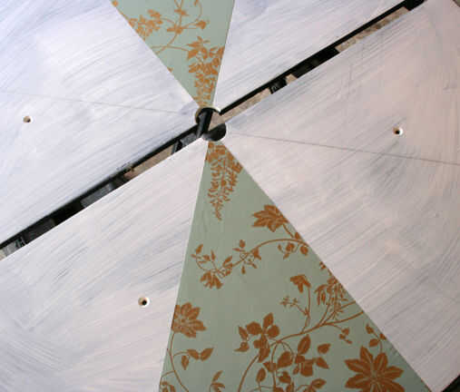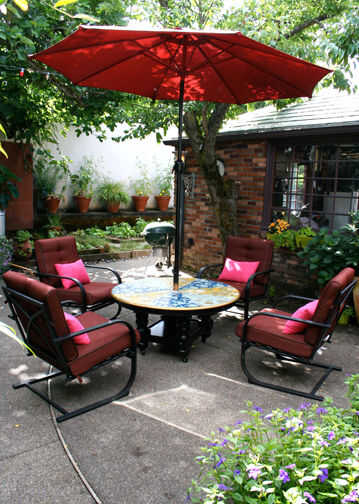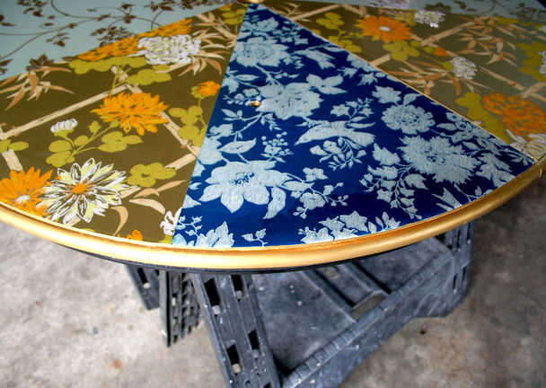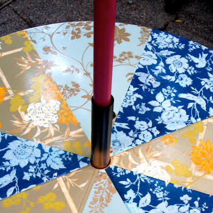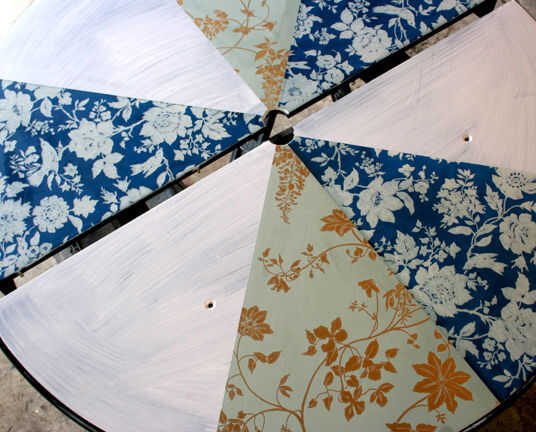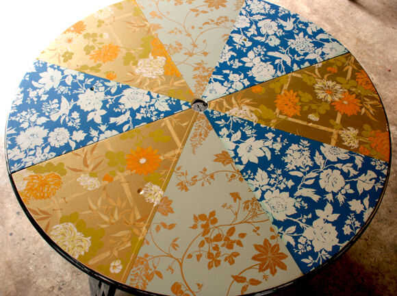 tabla de Patio lounge es un acento al aire libre de muebles de tienda de segunda mano, vintage papel pintado y pintura en aerosol. El vibrante diseño estimula la conversación y se mantiene siempre en flor. La baja altura hace que sea una tabla de los cabritos grandes. Que se necesita; 4 ruedas giratorias, (4) 1/4-20 x 1 1/2 "(4) tornillos 1/4-20 insertos roscados de muebles, paraguas y paraguas basan son opcional, pasta de papel pintado + cartilla, poliuretano con base de agua clara.
