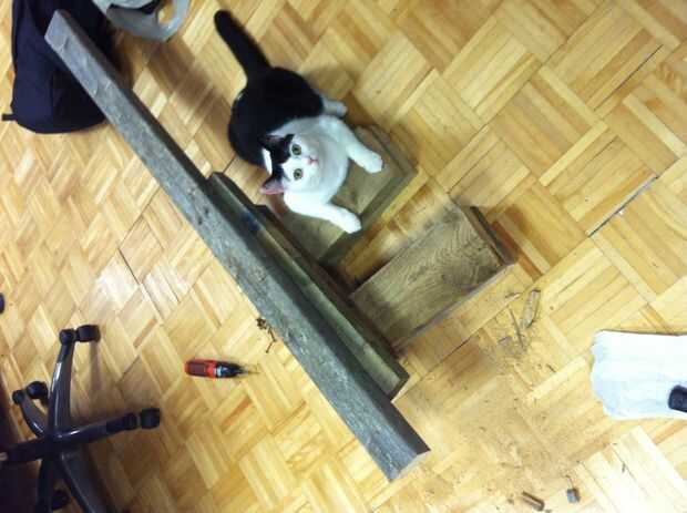 Con la ayuda de mi fiel gatito Odie quite todos los clavos y hardware permite para usar un prybar y mucha paciencia. Deseche cualquier madera con signes de daños por agua ni se pudren en algunos casos que usted puede puede solo cortar las partes podridas.