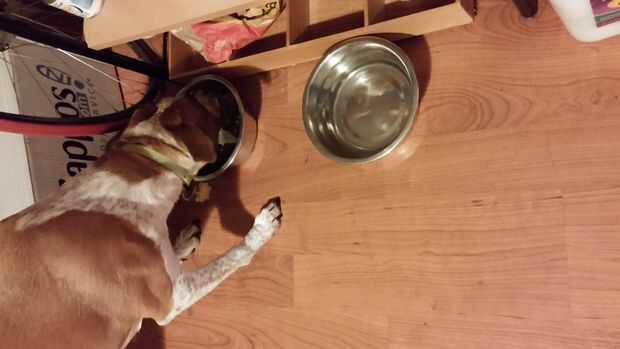 decidimos hacer un soporte de recipiente perro para nuestro perro, punto. Puedes ver el antes de imagen. Ella siempre Deslice su tazón de comida en mi rueda de bicicleta, y que tendría que inclinarse realmente conseguir el kibble. Ahora ella tiene una clase alta, cuadro personalizado para levantar sus tazones de fuente de acceso fácil y estable. Hemos hecho de caoba africana. También, lo hicimos en el TechShop en San José.