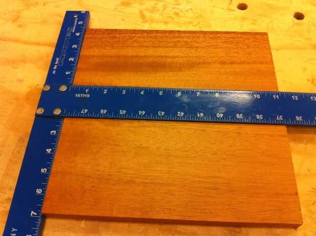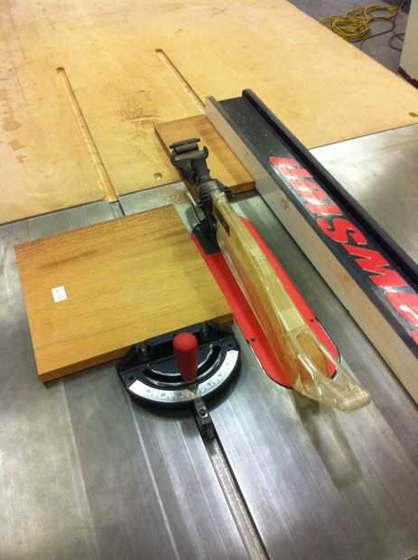 Empezamos con un tablero largo y hecho unos cortes en la tabla VI para obtener piezas para la tapa de tabla y las dos piernas.  Primero medimos hacia fuera las longitudes de cada pieza necesaria y marcada con la T cuadrada.  Luego ajuste la guía de la Sierra de mesa a la longitud adecuada y se deslizó la madera a través de!