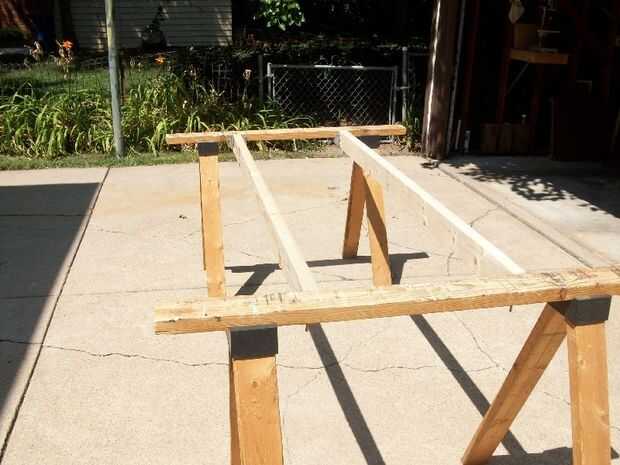 Coloque el pedazo de hoja de madera contrachapada en la parte superior y tiene una mesa de trabajo temporal rápido que es muy estable y puede soportar un poco de peso.