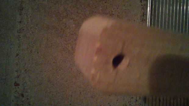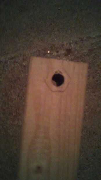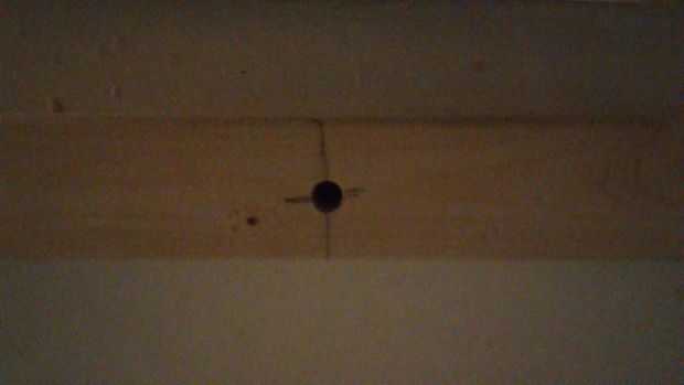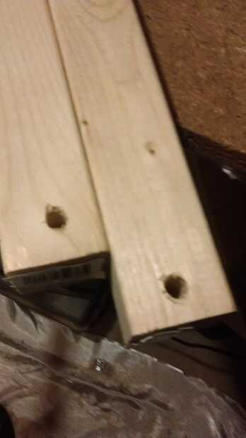 Tome uno de lo pies 1 adentro 10 lados y puesto contra un lado con los agujeros. Hacerlo al ras con la parte superior (extremo sin cortar) y el más largo de los dos lados. Ponga el lápiz a través del orificio del tornillo superior y marque la Junta. Perfore un agujero en el tablero con 5/16 en bits. Esto es donde las piernas se conectarán a la mesa. Repita para el otro lado.