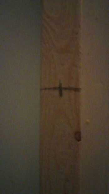 Ahora, mirando la pierna con el lado de ángulo paralelo a su cuerpo, medir 1 pies 10 adentro (22 adentro) de la parte inferior del ángulo. Esto marca y centro en el tablero. Se trata de donde se conectan las patas. Repita para las patas.