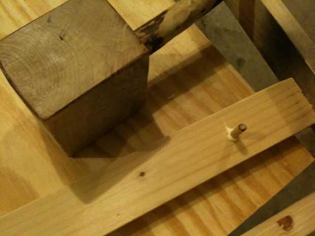 Yo corte una tira de ¾", fijada en su lugar y perforado a través de 2x4s vertical con ¼" bits a cada lado de las espigas de ¼", atornille debajo de la mesa en la ubicación correcta. Pegar los tacos sólo en el espaciador.