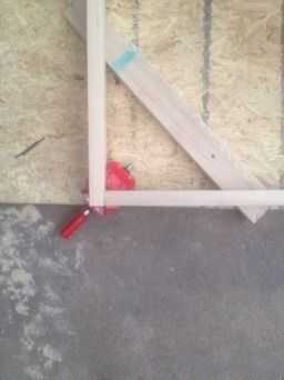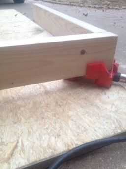 Ya que la abrazadera de ángulo recto se encuentra fuera de la tierra 1 1/2" y a su vez tiene 2 x 4 1 1/2" de la tierra, una de las otras piezas de 2 x 4 plano por debajo de los extremos no compatibles de los componentes apretados para crear un plano de nivel. De lo contrario, los extremos se combe y hacen muy difíciles de sujetar piezas correctamente. (ver imagen)