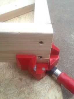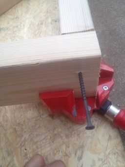 No es necesario aquí la abrazadera de ángulo recto para asegurar su lugar. Simplemente, mover uno de los extremos de la Cruz de la viga al ras con el extremo de la pierna y un tornillo del taladro para garantizar. Antes de perforar el segundo tornillo, sujete el otro extremo con un tornillo mientras que se sostiene en lugar con la rodilla. Las esquinas deben quedar al ras como sea posible. Ahora perfore un tornillo más en ambos extremos. (ver imagen)